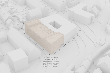 geplante Gebäudeflucht um einen Meter gegenüber der jetzigen Bebauung zurück. Der neue Block hat gemäß seiner innerstädtischen Lage vis-à-vis der Altstadt und auf Grund des umfangreichen