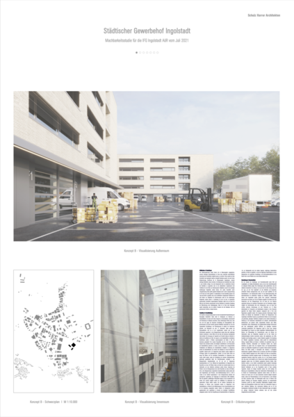 Der bauliche Lösungsvorschlag basiert auf einer konzeptionelle Neuentwicklung der Bauaufgabe Gewerbehof. Dabei stand im Vordergrund, ein Maximum an Gewerbeflächen mit einem sehr hohen Anspruch an