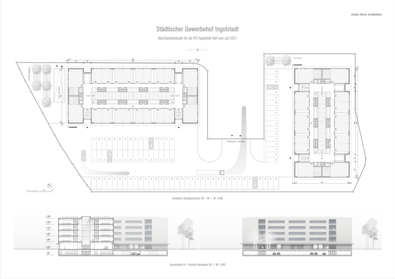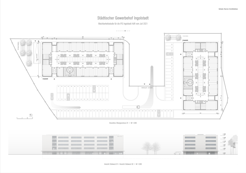 südwestlichen Längsfassade noch Freiflächen für eine Reihe von Kleintransporter Stellplätzen sowie für die benötigte Anlieferungen freigehalten werden können. Der zweite, hinsichtlich seiner