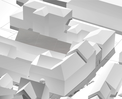 Die benachbarten Gebäude stehen teils sehr nahe an den Grundstücksgrenzen des zur verfügung stehenden Umgriffs und ergeben eine durchaus beengte räumliche Situation. Auf dem schmalen Grundstück wären