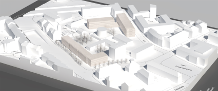 als die bereits etablierten fünfgeschossigen Gebäude sind, wird die kubatorische Sonderstellung der Kapelle respektiert. Für den Realisierungsteil wird ein L-förmiges Gebäude vorgeschlagen, das