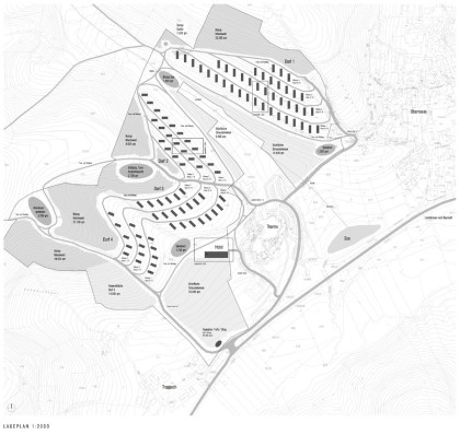 Die 200 Wohneinheiten des Feriendorfes sind in 4 Baufelder, den "Dörfern", und in vier Höhenlagen, den "Plateaus" in Art von hintereinander gestellten Doppelhäusern, den "Paaren" angeordnet. Die Dörfer sind situiert an den verschiedenen Hängen des Grundstückes und voneinander jeweils durch Grünschneisen (Talsenken mit Bachläufen, Bergrücken mit Haupterschliessung) getrennt. Hierdurch ergibt sich neben einer Herstellung von überschaubaren Einheiten auch eine gute Orientierbarkeit und Adressenbildung. Die Plateaus, auf denen die einzelenen Baukörper stehen, folgen den Höhenlinien und sind in Ihrer Höhenlage zueinander so gewählt, dass der großzügige Ausblick ins Tal von fast jedem Punkt der Anlage aus angeboten wird. Die Paare sind auf den Plateaus der einzelnen Dörfer so angeordnet, dass je nach Hanglage die beste Besonnung garantiert wird. Durch das Zusammenspiel dieser drei Ordnungsprinzipien entsteht trotz der Strenge der Anlage, ein der Topographie angepasster schwingender Rhythmus, der eine lockere Einbindung in die Landschaft gewährleistet. Das Hotel wird wie gefordert in unmittelbarer Nachbarschaft zur Therme angelegt (unterirdischer Zugang). Hier wird als Kontrast zu der kleinteiligen Baustruktur des Feriendorfes der Typus des Solitärs gewählt. Das Hotel soll im Gegensatz zu den Ferienhäusern, die sich in die Landschaft einbinden, gegenüber der Therme nicht zu stark in den Hintergrund treten und dabei eine Fernwirkung entfalten.