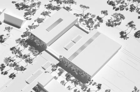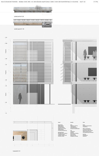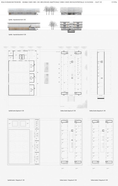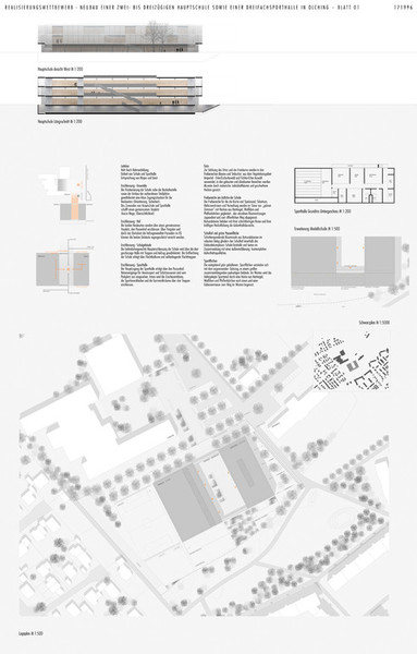 Die Positionierung der Schule nahe der Bushaltestelle sowie der Umbau der vorhandenen Stellplätze gewährleistet eine klare Zugangssituation für die Neubauten (Orientierung, Sicherheit). Das Zuwenden von Hauptschule und Sporthalle schafft einen gemeinsamen Vorplatz (kurze Wege, Übersichtlichkeit). Die beiden Neubauten werden über einen gemeinsamen Vorplatz, den Pausenhof erschlossen. Über Pergolen und durch das Einrücken der hofzugewandten Fassaden im EG können die beiden Gebäude regengeschützt erreicht werden. Die behindertengerechte Haupterschliessung der Schule wird über die drei- geschossige Halle mit Treppen und Aufzug gewährleistet. Die Entfluchtung der Schule erfolgt über Fluchtbalkone und außenliegende Fluchttreppen. Der Hauptzugang der Sporthalle erfolgt über den Pausenhof. Nebeneingänge für Vereinssport und Schützenverein sind vom Parkplatz aus vorgesehen. Intern wird die Zuschauertribüne, die Sportlerumkleiden und die Gymnastikräume über drei Treppen erschlossen. Zur Stärkung des Ortes und der Freiräume werden in den Freibereichen Bäume und Sträucher aus dem Vegetationsgebiet Ampertal - Erlen-Esche-Auwald und Fichten-Erlen Auwald verwendet, in den gebauten und überbauten Bereichen werden Akzente durch malerische Judasblattbäume und geschnittene Hecken gesetzt. Die Freibereiche für die die Küche und Speisesaal, Silentium, Mehrzweckraum und Verwaltung werden im Sinne von „grünen Zimmern“ mit Hecken aus Hartriegel, Weißdorn und Pfaffenhütchen gegliedert , den einzelnen Raumnutzungen zugeordnet und zum öffentlichen Weg abgegrenzt. Katsurabäume beleben mit ihrer schirmförmigen Krone und ihrer kräftigen Herbstfärbung die Aufenthaltsbereiche. Schattenspendende Bauminseln aus Katsurabäumen im robusten Belag gliedern den Schulhof innerhalb des Gebäudekomplexes Schule-Turnhalle und bieten im Zusammenhang mit einer Außenmöblierung kontemplative Aufenthaltsqualtiäten. Die weitgehend grün gehaltenen Sportflächen verbinden sich mit dem angrenzenden Grünzug zu einem großen zusammenhängenden parkartigen Gelände. Im Westen wird das tiefergelegte Sportareal durch eine Hecke aus Hartriegel, Weißdorn und Pfaffenhütchen nach innen und einer Gabionenmauer zum Weg im Westen begrenzt.