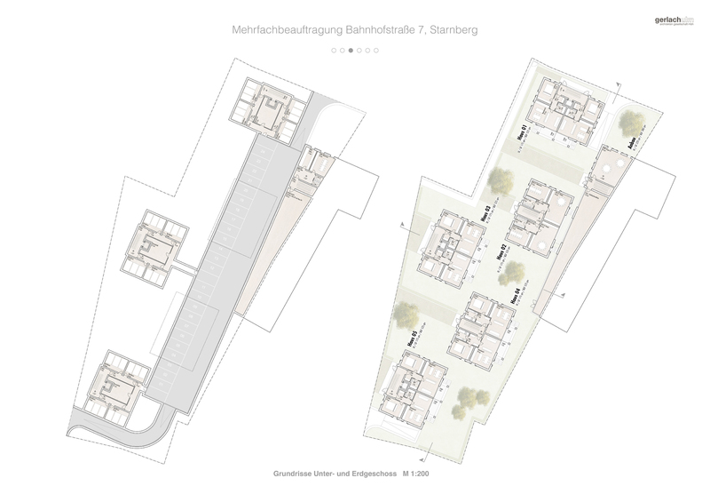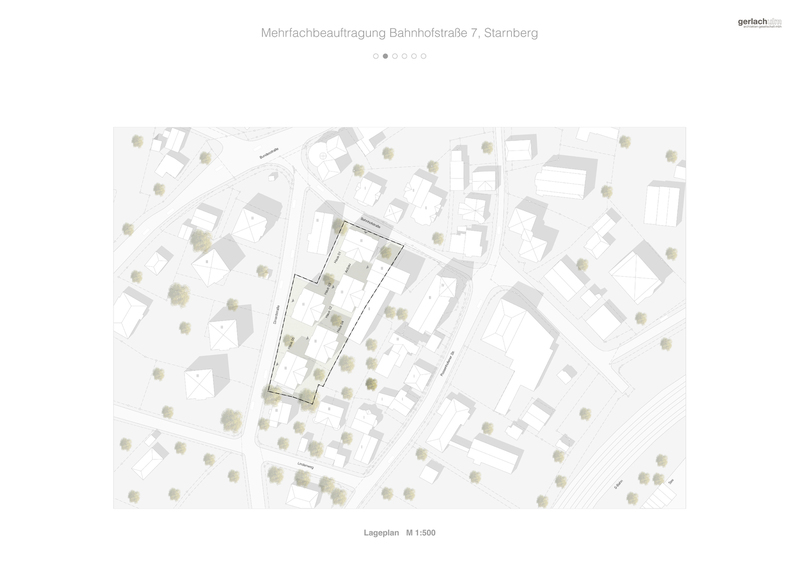 Für sie stadträumliche Setzung der Gebäude wird die „Variante D“ der Vorstudie gewählt. Die lockere Verteilung der Häuser bei fast durchgehende Ausrichtung zum See hin wird als äußerst vorteilhaft für die Unterbringung von gehobenen Wohnraum beurteilt. Auch können so gut proportionierte und nutzbare Außenräume zwischen den Häusern angeboten und gleichzeitig kurze Erschliessungswege angeboten werden. Adressierung, Versorgung mit Tageslicht und natürlicher Belüftung sind unproblematisch. Freiräume können auf Wunsch einzelnen Häusern zugeordnet werden. Die in der „Variante D“ vorgeschlagene Grenzbebauung wird schmaler ausgeführt, sodass das die einzelnen Häuser auch im Bereich des Anbaus frei stehen können. So bekommt auch die geplante Kindertagesstätte in den Vorzug besserer Belichtung und Belüftungsverhältnisse. Wie in der Auslobung gewünscht wird eine Fußgängerverbindung von der Dinardstraße zur Bahnhofstraße vorgesehen.