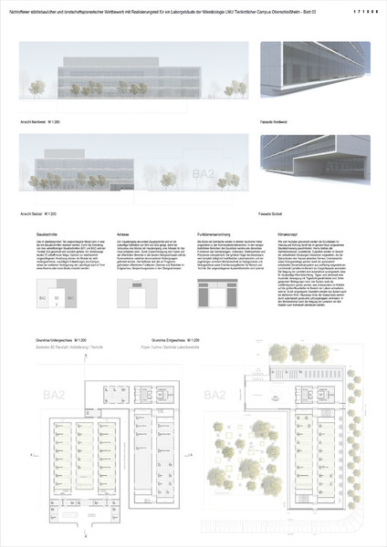 Das im städtebaulichen Teil vorgeschlagene Modul kann in zwei bis drei Bauabschnitten realisiert werden. Durch die Errichtung von zwei winkelförmigen Bauabschnitten (BA1 und BA2) wird der Tierstall (S3) geschützt und räumlich gefasst. Ein Verbindungs- bauteil (V) schafft kurze Wege. Optional zur stadträumlich vorgeschlagenen Anordnung können die Module bei nicht vorhergesehenen, zukünftigen Entwicklungen des Campus neben der einfachen Verlängerung der Laborflügel auch in Form eines Kamms oder eines Blocks erweitert werden.