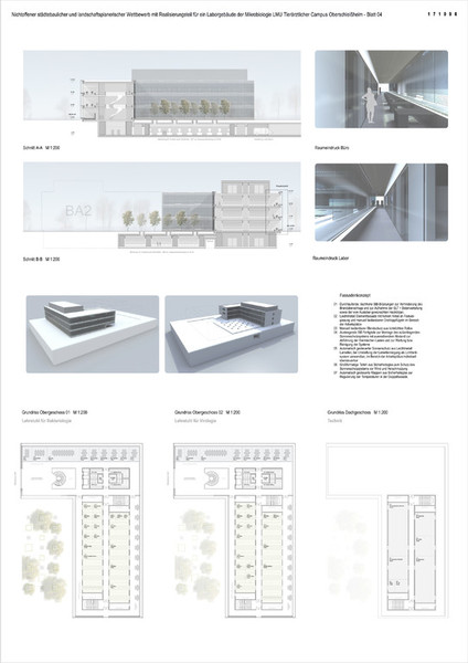 Sanitäranlagen, Umkleiden, Elektroverteiler und Putzräume untergebracht. Der größere Flügel des Baukörpers wird komplett belegt mit hochflexiblen Laborbereichen und der zugehörigen zentralen