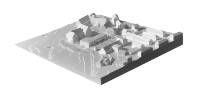 explizit keine der vorhanden Baukörperorthogonalitäten aufgenommen, um eine dadurch potentiell entstehende Paarbildung zu vermeiden. Die Entscheidung, die geneigten Dächer der Umgebung beim Neubau